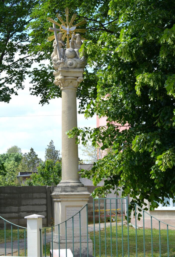Állított hasáb formájú talapzaton, hengeres oszlop tetején található a Szentháromság homokkő szobra, a régi községháza előkertjében (nincs kizárva, hogy valamikor paplak volt), a templom közelében. A Fiúisten és az Atyaisten homokkőből, a Szentlelket jelképező galamb fémből készült, az oszlopfőt puttó dombormű díszíti. Az egész 2003-ban szépen restaurálva, sárgára festve.