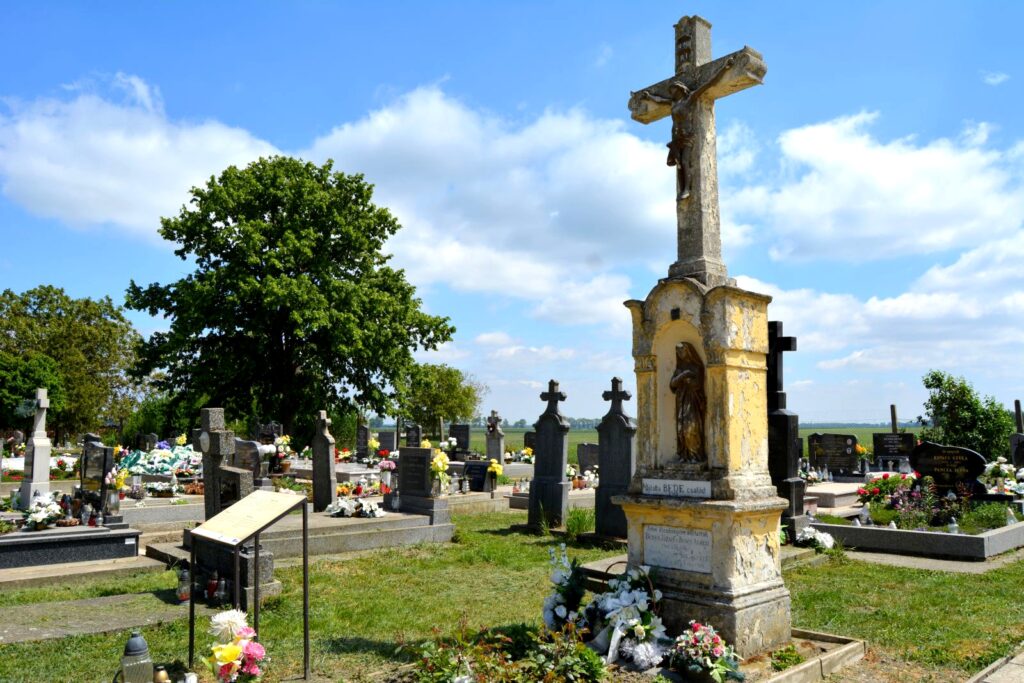 A temető központi kőkeresztje öntöttvas korpusszal 1863-ból való, Isten dicsőségére állíttatták a Benes testvérek, András és József. A négyzetes talapzat első részén Szűz Mária-szobor áll.