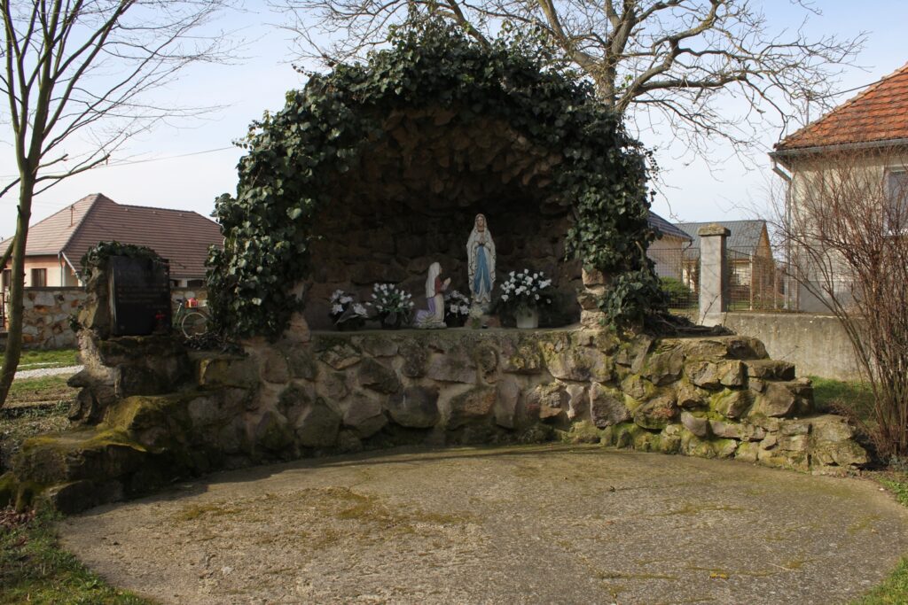 A templom mellett Lourdes-i barlang látható, a Lourdes-i Szűz Mária és a térdeplő Bernadett szobrával, amelyet 1998-ban kőből épített a dacsókeszi Kosík József.