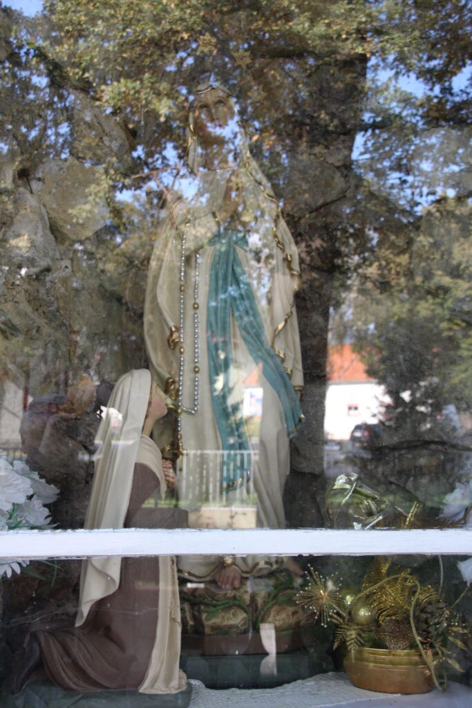 Lourdes-i barlang – a Szűz szobra kb. 70 cm magas, színes kerámiából készült, üvegfal mögött áll.
