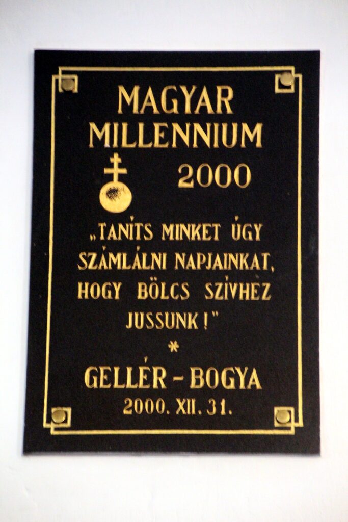 A templomban található emléktáblát a magyar millennium emlékére 2000-ben állíttatta a gellér-bogyai református társegyházközség.