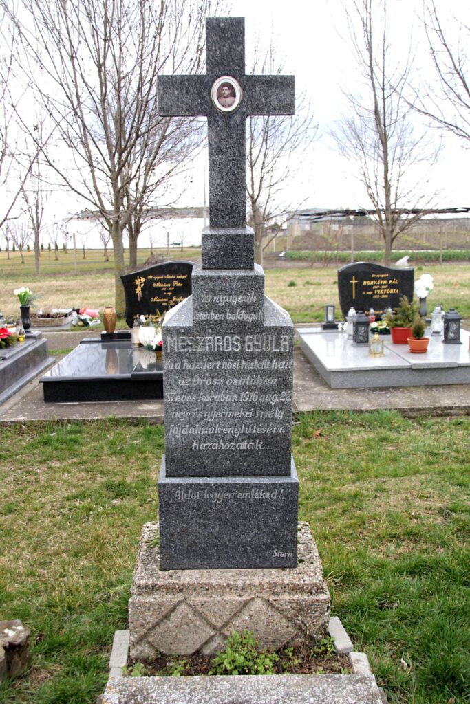 Mészáros Gyula, 37 éves korában, 1916. augusztus 22-én a hazáért hősi halált halt az orosz csatában. Neje és gyermekei mély fájdalmuk enyhítésére hazahozatták.