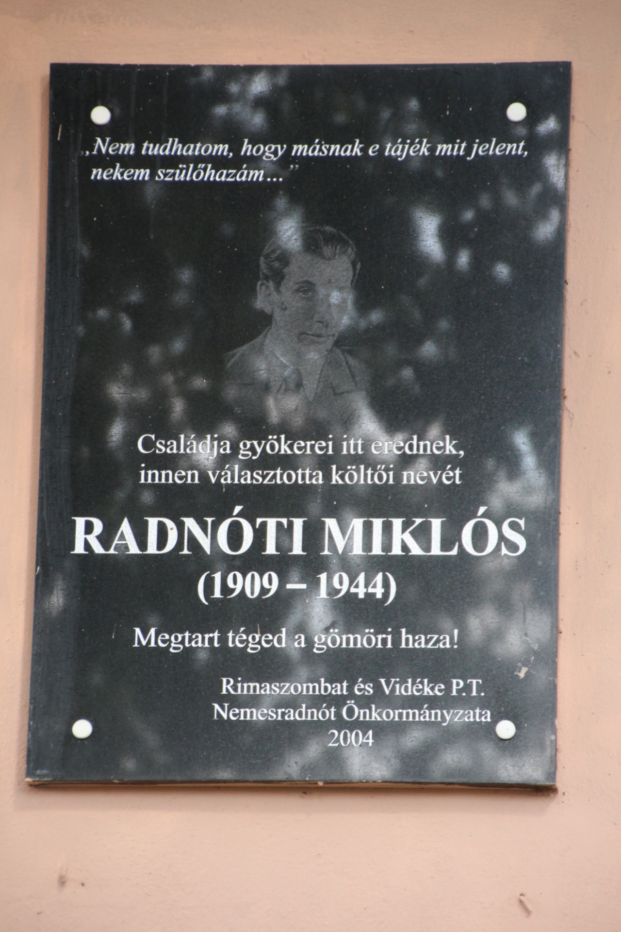 Felirat"Nem tudhatom, hogy másnak e tájék mit jelent, / nekem szülőhazám... / Családja gyökerei itt erednek, / innen választotta költői nevét / RADNÓTI MIKLÓS / (1909 - 1944) Megtart téged a gömöri haza! / Rimaszombat és Vidéke P.T. / Nemesradnót Önkormányzata / 2004
