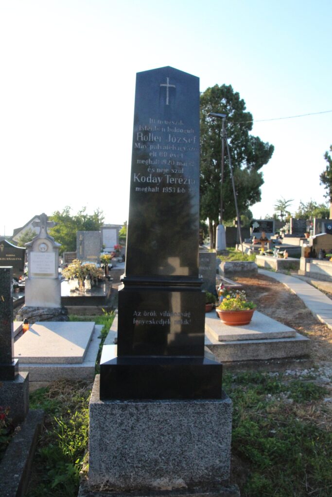 | Felirat | Itt nyugszik / Istenben boldogult / Roller József / Máv. pályafelvigyázó / élt 60 évet / meghalt 1920 máj 12. / és neje szül. / Koday Terézia / meghalt 1953 feb. 22. // Az örök világosság / fenyeskedjék nekik! |