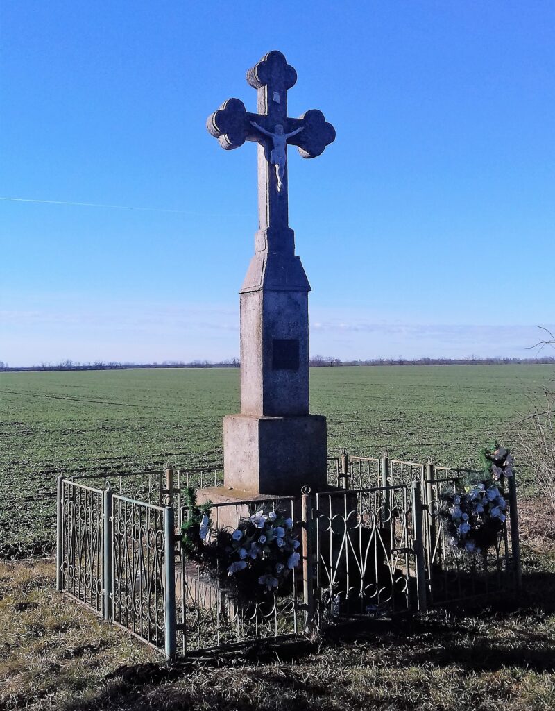 A keresztet a huszadik század elején Sallai Miklós állíttatta a földjei előtt. A II. világháborúban a kereszt erősen megrongálódott, 1946-ban Árendás István újra felállította, de már műkőből, az eredeti korpusszal. A keresztet Isten dicsőségére 1972-ben ismét felújították és a család utódai gondozzák. A felirat már felújításra szorul.