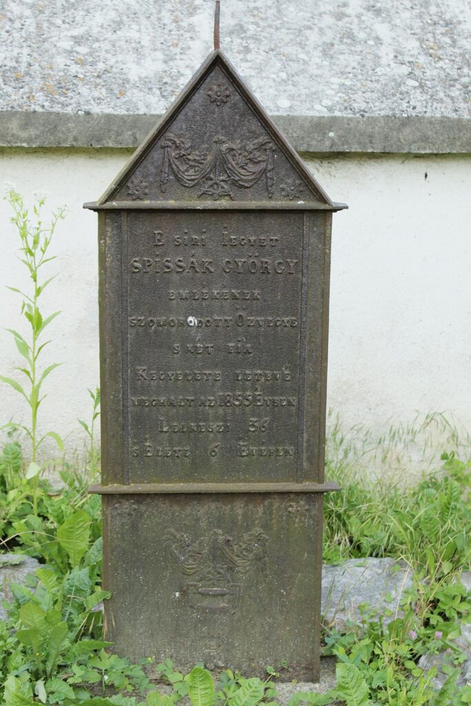 | Felirat | A siri jegyet / SPISSÁK GYÖRGY / emlékének / szomorodott Özvegye / s két fia / kegyelete letevé / meghalt az 1855 évben / Lelkészi 36 / s élete 6? évében |