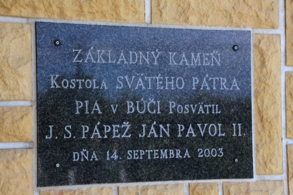 FeliratBÚCSI SZENT PIO ATYA / TEMPLOMÁNAK ALAPKÖVE / MEGSZENTELTE / Ő. SZ. II. JÁNOS PÁL PÁPA / 2003. SZEPTEMBER 14-ÉN