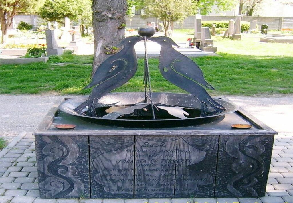 A temetőben található világháborús emlékmű előtt lévő kopjafákat és díszkutat csicsói mesterek készítették, 2002-ben adták át. A kopjafa ezen a tájon ismeretlen volt. A díszkút az eredeti gémeskút fölé épült, meghagyva a kútágast a kútgémmel, szépen faragott káváján pedig 4 vaslemez főnixmadár áll, csőrükkel a bölcsek kövét tartják. Ezek a gémekhez hasonló mitológiai madarak az állandóan megújuló életet jelképezik. A káva felirata: