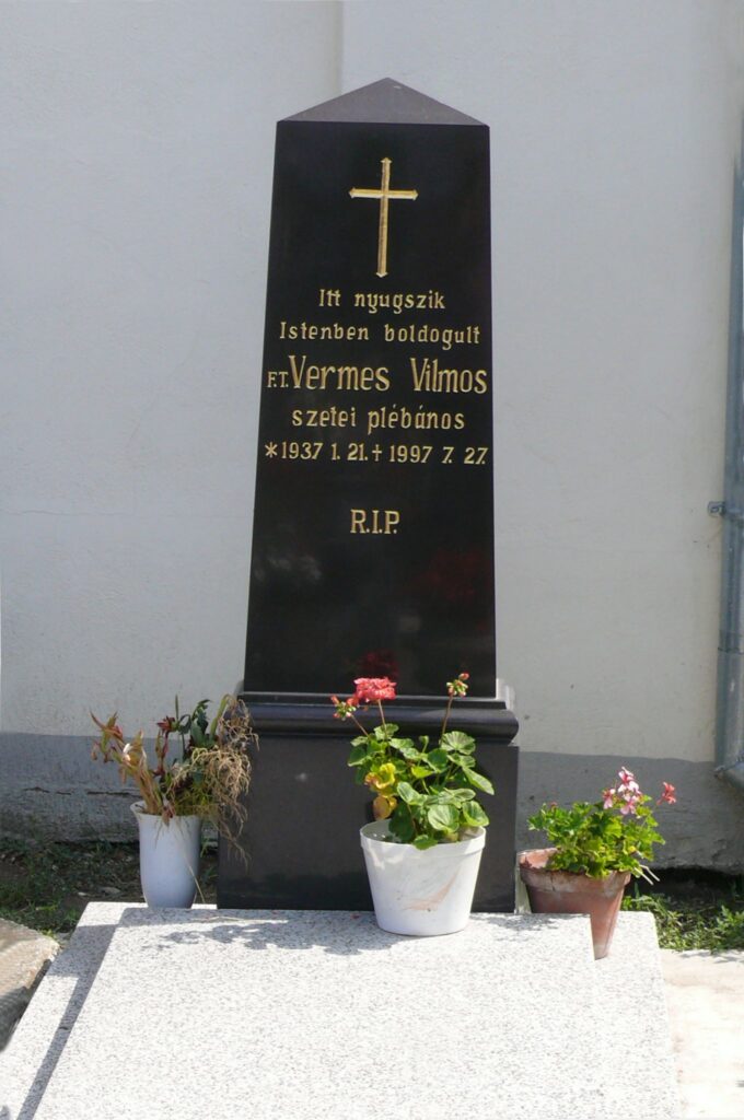 FeliratItt nyugszik / Istenben boldogult / F.T. Vermes Vilmos / szetei plébános / * 1937. 1. 21 + 1997. 7 .27. / R.I.P.