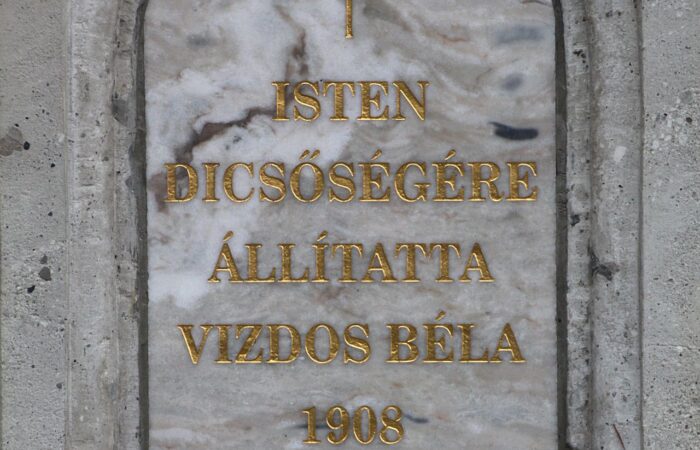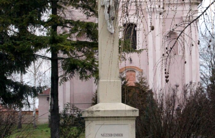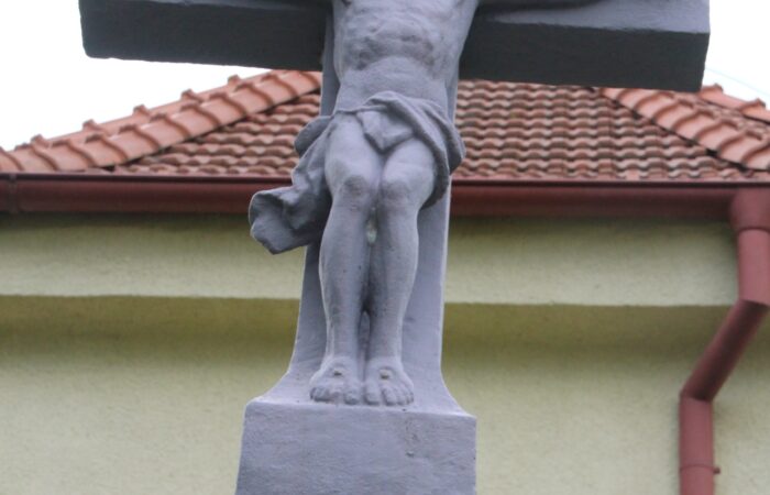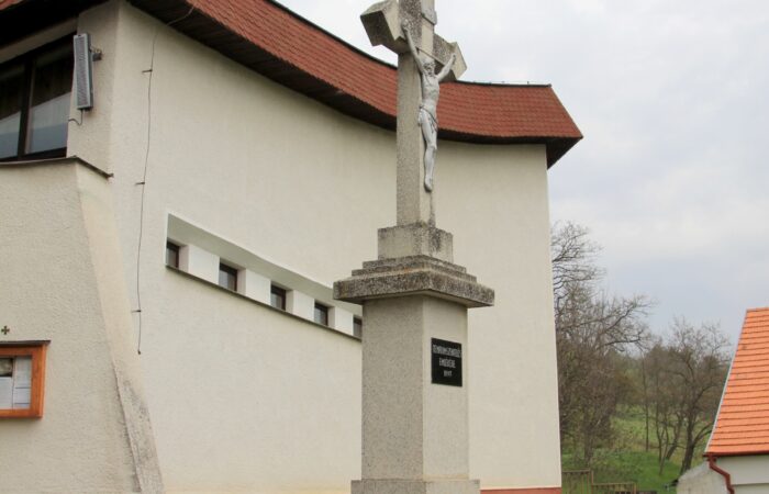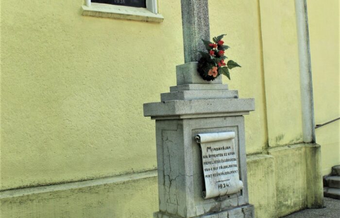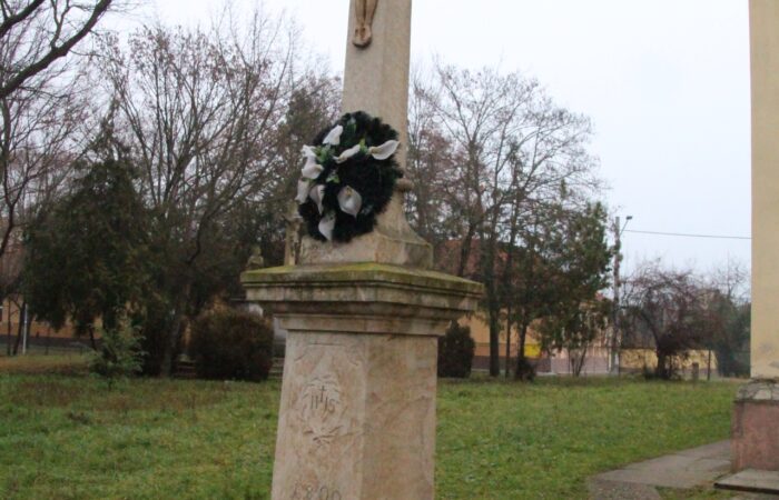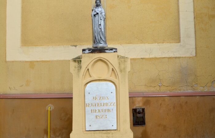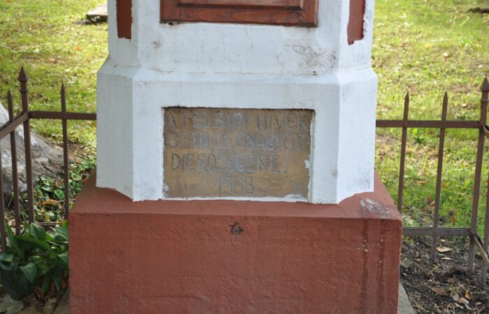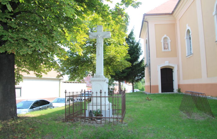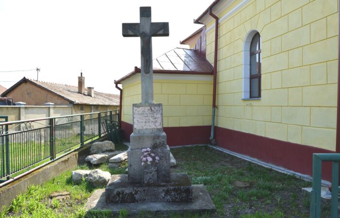 [A templomkertben] látható az a négylépcsős, csipkézett szárú, vaskorpuszos templomkerti kőkereszt, melynek dedikációján ezt olvassuk: „Isten dicsőségére álítá BURIS MÁRIA 1908.” A helybeliek szerint a középparaszti szintű gyermektelen házaspár valószínűleg fohászként vagy Isten iránti elkötelezettsége jeléül emeltette a szép korpuszos kőkeresztet.