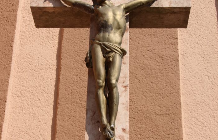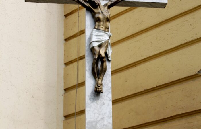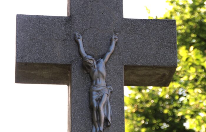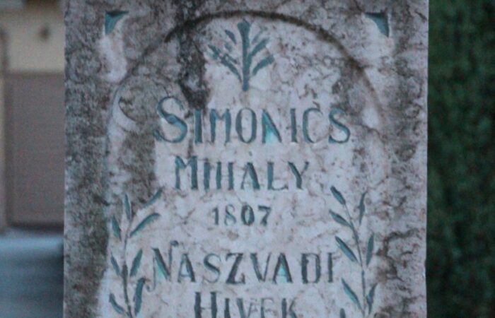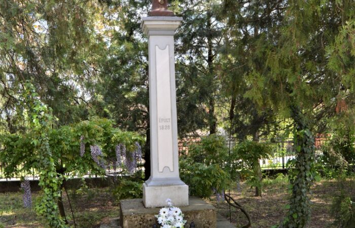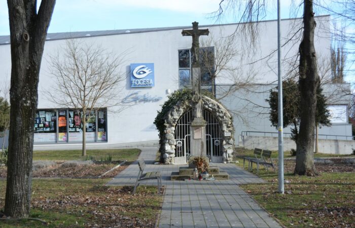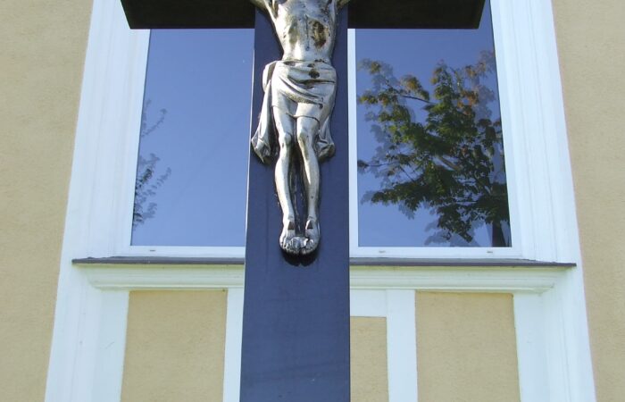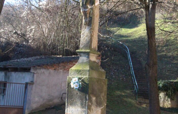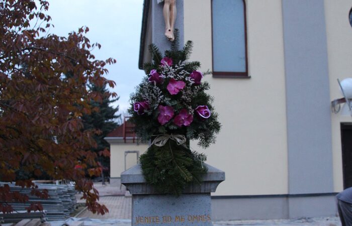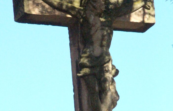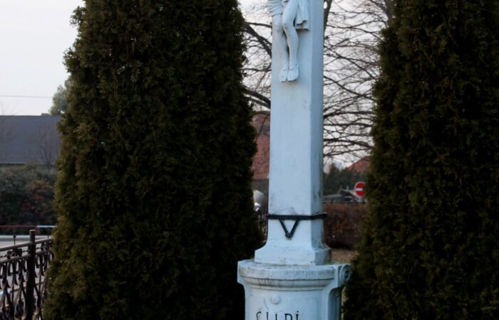 [A templomkertben] látható az a négylépcsős, csipkézett szárú, vaskorpuszos templomkerti kőkereszt, melynek dedikációján ezt olvassuk: „Isten dicsőségére álítá BURIS MÁRIA 1908.” A helybeliek szerint a középparaszti szintű gyermektelen házaspár valószínűleg fohászként vagy Isten iránti elkötelezettsége jeléül emeltette a szép korpuszos kőkeresztet.