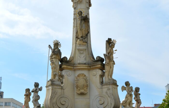 1740-ben a várost pestisjárvány sújtotta. Annak reményében, hogy csakhamar elmúlik a veszély, a Szentháromságnak emeltek szobrot. Olyan kultúrtörténeti műemlék ez tehát, amely a város történelméhez kapcsolódik, 1749-ben fejezték be építését. Művészi barokk szoborcsoportról van szó, amelyet rokokó elemek díszítenek, s amely a korabeli közterület-díszítő szobrászművészet színvonaláról ad képet. Több mint valószínű, ismeretlen olasz mesterek munkája....