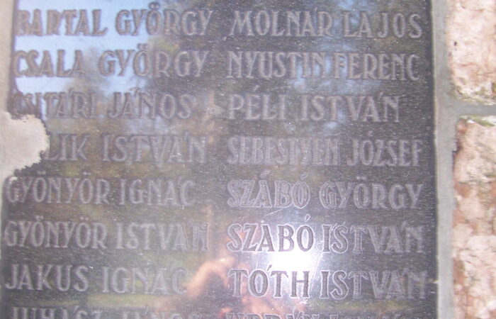 A katolikus templom főhajójának falán találjuk az 1936-ban az I. világégés helyi hősi halottjaira emlékező, arany betűkkel teleírt, vörösmárvány táblát.