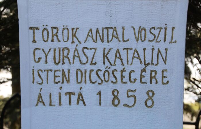 Az egylépcsős, szürke gránitkőből emelt feszület díszes oszlopán ez a dedikáció olvasható: „Isten dicsőségére állíttatta Bartal Pál 1922. évben”. Eredetileg feltételezhetően nem ez a szöveg állt az oszlopon, hisz felfedezhetők rajta egy régebbi írás nyomai is, Sajnos ez már nem olvasható – talán „és a világháborúban elesett hősök emlékére” – D. E. megjegyzése. A díszes oszlopfőn...