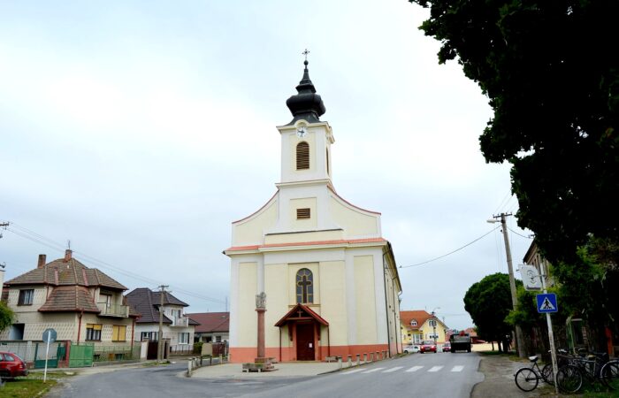 A római katolikus templom főhomlokzata előtt áll az oszlopon elhelyezett Szentháromság-szobor, amelyet Somogyi Gábor állíttatott 1857-ben.