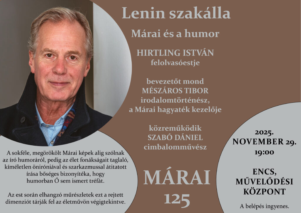 Kedves érdeklődők, a szervezők kérésére közöljük, hogy 2025. november 29-én, szombaton, 19:00 órai kezdettel Hirtling István Márai 125 felolvasóestjét tartják a határhoz közeli ENCS település MŰVELŐDÉSI KÖZPONTJÁBAN. Akinek esetleg lehetősége, kedve van, vagy épp erre jár, kérik, térjen be hozzájuk az esemény időpontja alatt. A belépés ingyenes. További információk a mellékelt plakáton.