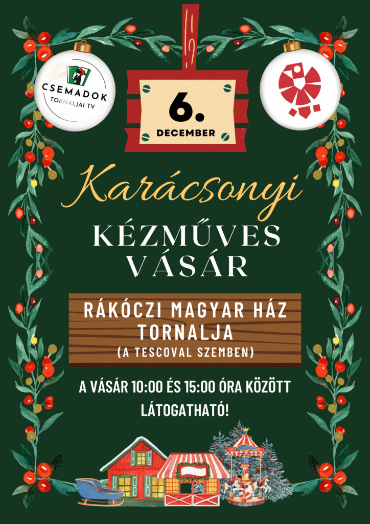A Csemadok TV és a Rákóczi Szövetség Tornaljai szervezete tisztelettel meghívja Önt a helyi karácsonyi kézműves vásárra, amely 2025. december 6-án, 10.00 és 15.00 óra között látogatható meg a Rákóczi Magyar Házban. Minden érdeklődőt szeretettel várunk.