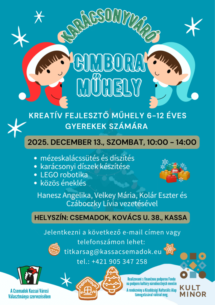 A hagyományokhoz híven a karácsonyi ünnepek előtt idén is megszervezésre kerül a kreatív fejlesztő CIMBORA MŰHELY 6-12 éves gyerekek számára.