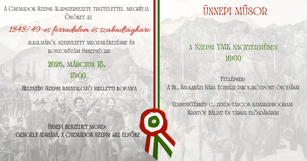 Meghívó 2026. március 15-én, vasárnap 15:30-kor az 1848-49-es magyar szabadságharc alkalmából szervezett megemlékezésre és koszorúzásra.