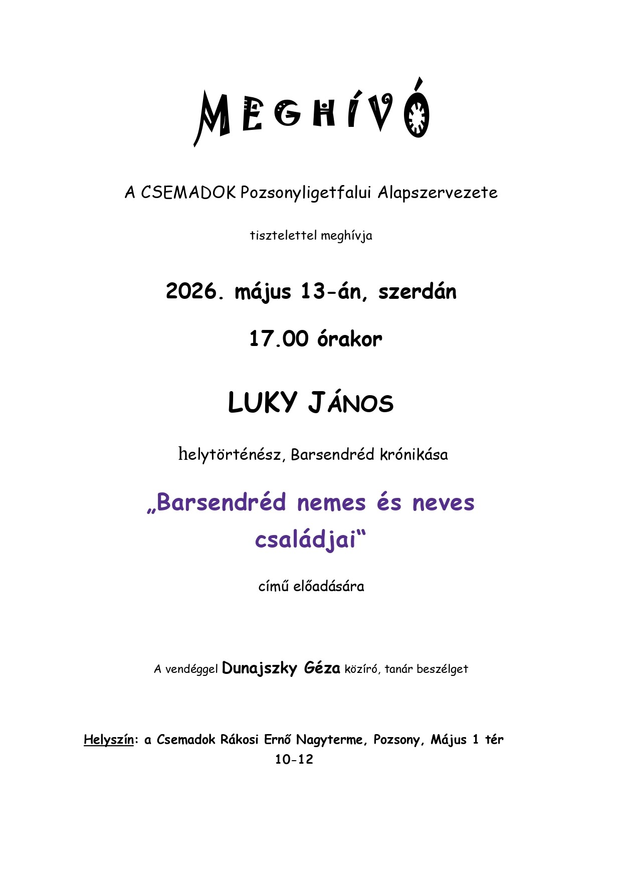 „Barsendréd nemes és neves családjai” Luky János helytörténész előadása máj 13 17:00 „Barsendréd nemes és neves családjai” Luky János helytörténész előadása
