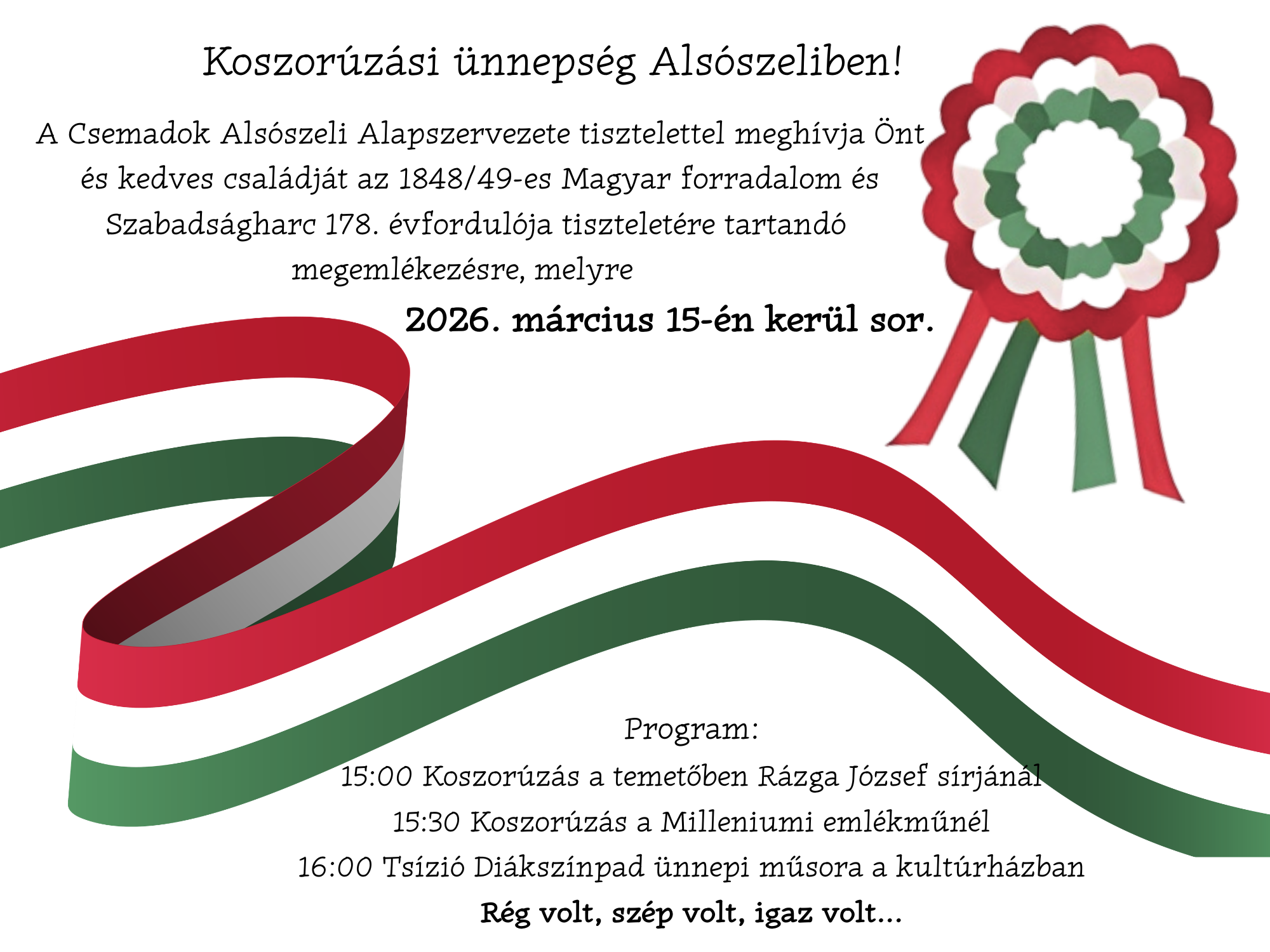 Koszorúzási ünnepség a magyar forradalom és szabadságharc kitörésének 178. évfordulója alkalmából Vágsellyén márc 13 17:00 Koszorúzási ünnepség a magyar forradalom és szabadságharc kitörésének 178. évfordulója alkalmából Vágsellyén
