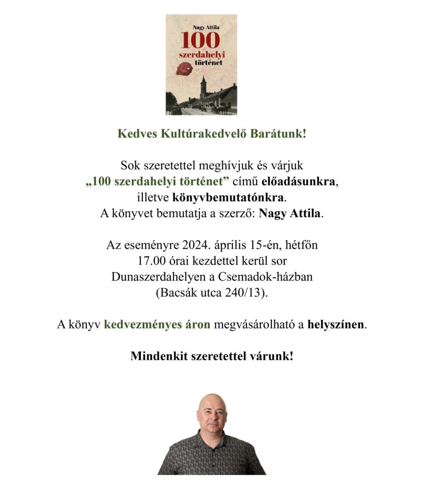 Sok szeretettel meghívjuk és várjuk „100 szerdahelyi történet” című előadásunkra, illetve könyvbemutatónkra. A könyvet bemutatja a szerző: Nagy Attila.