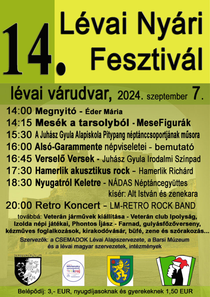 Tisztelettel meghívjuk Önöket az immár hagyománnyá váló Lévai Nyári Fesztiválra, melyet 14. alkalommal rendezünk meg 2024. szeptember 7-én délután 2 órai kezdettel a lévai vár udvarán. A műsorban szerepelnek: a MeseFigurák Fülekről, a Juhász Gyula Alapiskola tanulói, Alsó-Garammente népviseletei, a Juhász Gyula Irodalmi Színpad, Hamerlik Akusztikus Rock, a NÁDAS néptáncegyüttes Farnadról és az LM-RETRO ROCK BAND. Továbbá megnézhetik a Veterán autók kiállítását – az ipolysági Veterán club jóvoltából, a gyermekek élvezhetik Izolda Népi Játékait. Szívesen fogadjuk a kézműveseket, Phontos Íjászokat és a könyvárusokat, akik színesebbé teszik a fesztivált. Hagyományosan a gulyásfőzőversenyt is megrendezzük. Gyermekek és felnőttek is megtalálhatják a kedvükre való programot, kellemes családi délutánt lehet eltölteni a patinás lévai vár udvarán.