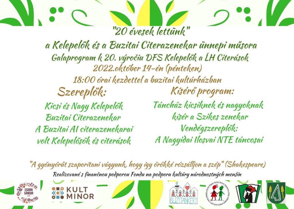 A Csemadok Kassa-környéki Területi Választmány titkáraként örömmel továbbítom a Buzitai Kelepelők és a Buzitai Citerazenekar meghívóját a néptánccsoport és a citerazenekar megalakulása 20. évfordulója alkalmából rendezett gálaműsorára és ünnepélyére. Az ünnepi műsor Buzitán lesz a helyi kultúrház nagytermében, 2022. október 14-én, pénteken délután, 18:00 órai kezdettel.