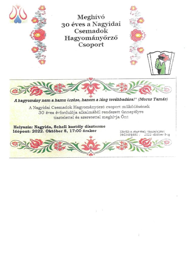 A Csemadok Kassa-környéki Területi Választmány titkáraként örömmel továbbítom a Nagyidai Csemadok Hagyományőrző Csoport meghívóját a népművészeti csoport megalakulása 30. évfordulója alkalmából rendezett gálaműsorára és ünnepélyére. Az ünnepség Nagyidán lesz a Schell kastély dísztermében, 2022. október 8-án, szombaton délután, 17:00 órai kezdettel. A Csemadok Kassa-környéki Területi Választmány Elnöksége és titkársága tisztelettel és szeretettel vár benneteket az ünnepségre.