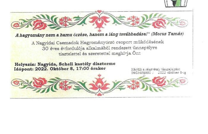 A Csemadok Kassa-környéki Területi Választmány titkáraként örömmel továbbítom a Nagyidai Csemadok Hagyományőrző Csoport meghívóját a népművészeti csoport megalakulása 30. évfordulója alkalmából rendezett gálaműsorára és ünnepélyére. Az ünnepség Nagyidán lesz a Schell kastély dísztermében, 2022. október 8-án, szombaton délután, 17:00 órai kezdettel. A Csemadok Kassa-környéki Területi Választmány Elnöksége és titkársága tisztelettel és szeretettel vár benneteket az ünnepségre.