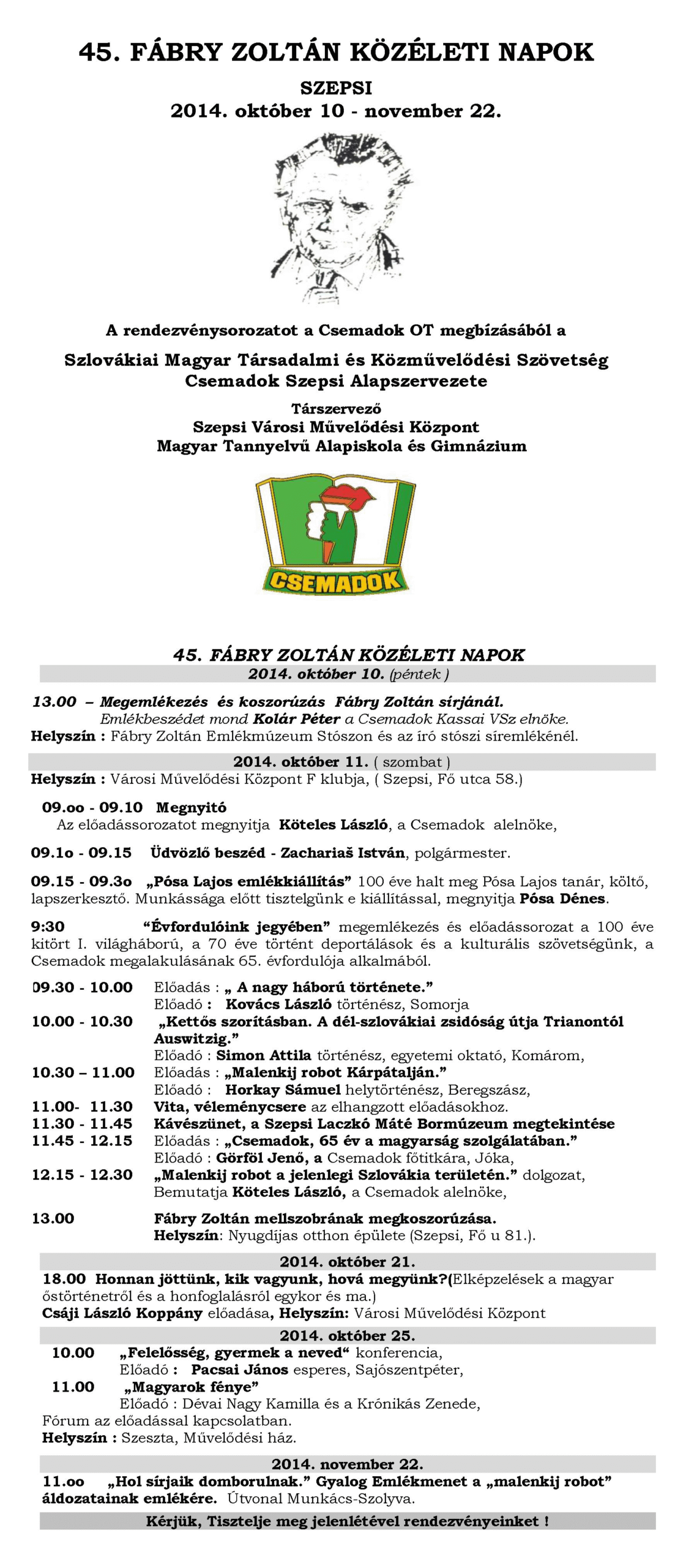 2014. október 10 – november 22. / A rendezvénysorozatot a Csemadok OT megbízásából a Szlovákiai Magyar Társadalmi és Közművelődési Szövetség, a Csemadok Szepsi Alapszervezete rendezi. / Társzervező a Szepsi Városi Művelődési Központ, a Magyar Tannyelvű Alapiskola és Gimnázium