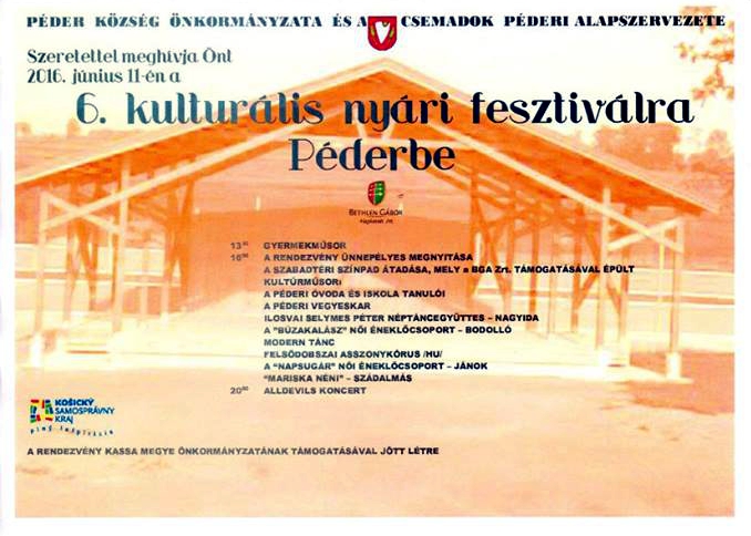 A Péderi Községi Hivatal és Önkormányzat és a Csemadok Péderi Alapszervezete Szeretettel hívja Önt és kedves családját, ismerőseit, barátait a 6. Kulturális Nyári Fesztiválra Péderben. A fesztiválra 2016. június 11-én, szombaton délután kerül sor 13:00 órai kezdettel a község szabadtéri színpadán.