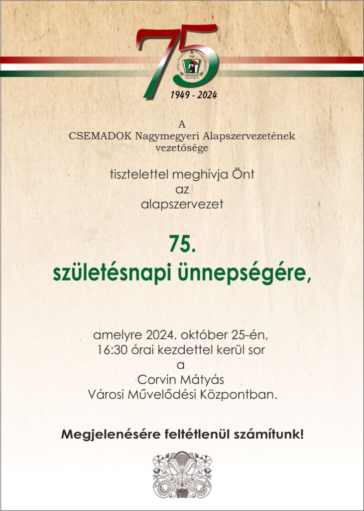 Tisztelettel meghívjuk a CSEMADOK NAGYMEGYERI SZERVEZETE megalakulásának 75. évfordulója alkalmából szervezett ünnepségre, amely 2024. október 25-én pénteken, 16:30 órai kezdettel kerül megrendezésre a nagymegyeri Corvin Mátyás Művelődési Központban.