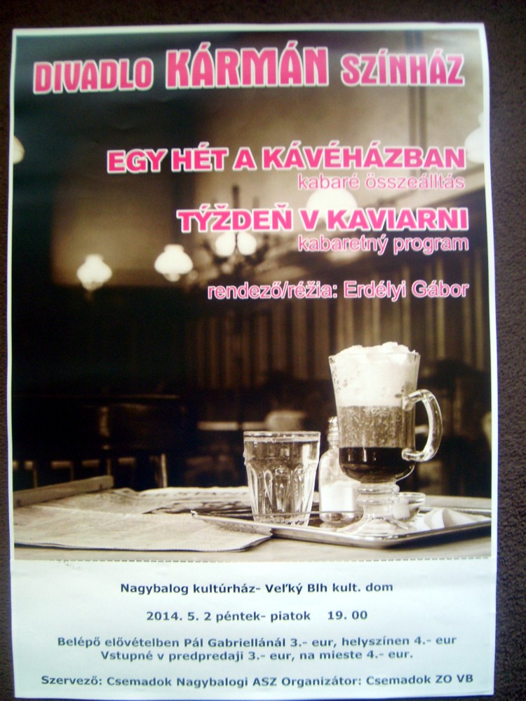 Egy hét a kávéházban, kabaréösszeállítás (Erdélyi Gábor rendezésében), 2014. május 2-án, pénteken, 19.00 órakor a nagybalogi kultúrházban.