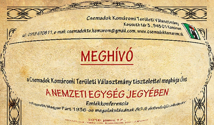 A Csemadok Komáromi Területi Választmánya és Fórum Kisebbségkutató Intézete tisztelettel meghívja Önt az Egyesült Magyar Párt 1936-os megalakulásának 80-ik évfordulója alkalmából szervezett A NEMZETI EGYSÉG JEGYÉBEN c. emlékkonferenciára.