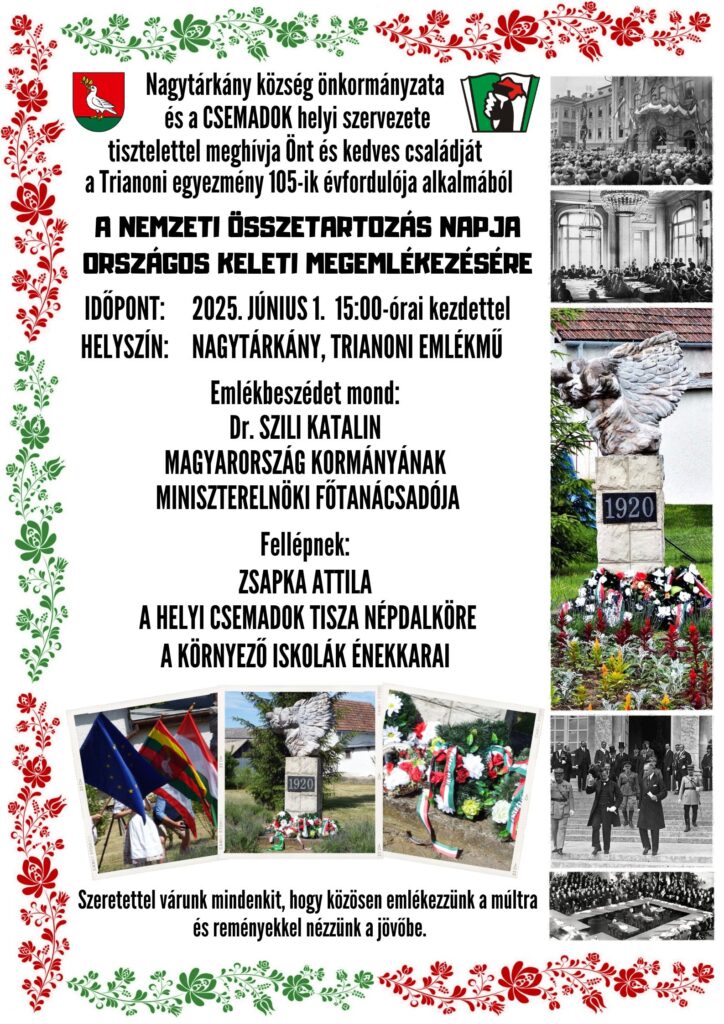 Nagytárkány község önkormányzata és a CSEMADOK helyi szervezete tisztelettel meghívja Önt és kedves családját a Trianoni egyezmény 105-ik évfordulója alkalmából „A NEMZETI ÖSSZETARTOZÁS NAPJA ORSZÁGOS KELETI MEGEMLÉKEZÉSÉRE”