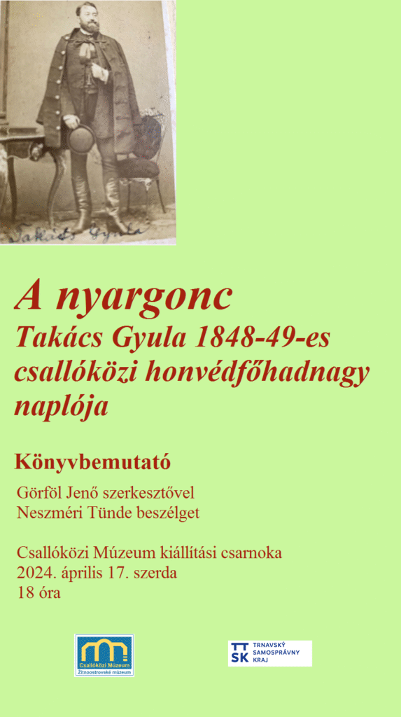 A Csallóközi Múzeumban kerül sor A nyargonc című kötet bemutatójára, amely az 1848-49-es magyar forradalom és szabadságharc egyik legjelentősebb, de mindeddig ismeretlen csallóközi személyisége, Takács Gyula honvédfőhadnagy, Görgei Artúr parancsőrtisztje nemrég előkerült kéziratos naplójának kiadása. Ebben részletesen leírja a nagy történelmi eseményeket, amelyeknek személyes tanúja volt, de megjelenik benne a korabeli Csallóköz és Dunaszerdahely is.