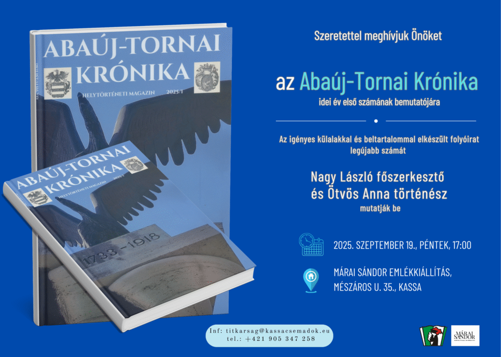 Szeretettel meghívjuk Önöket az Abaúj-Tornai Krónika idei év első számának bemutatójára a Márai Sándor Emlékkiállításba (Mészáros/Mäsiarska utca 35.) 2025. szeptember 19-én, pénteken, 17:00 órai kezdettel. Az igényes külalakkal és beltartalommal elkészült folyóirat legújabb számát Nagy László főszerkesztő és Ötvös Anna történész mutatják be.