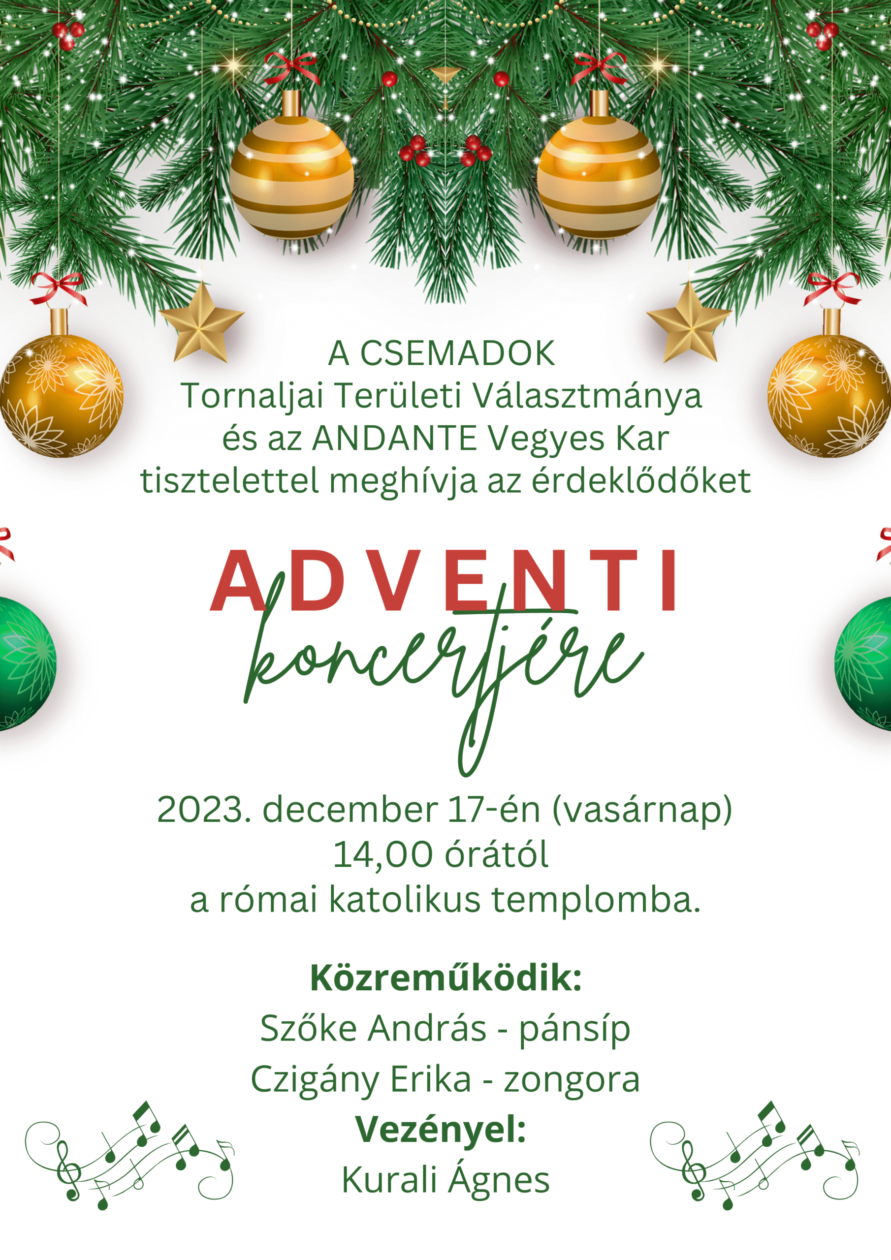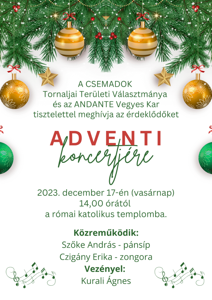 A CSEMADOK Tornaljai Területi Választmánya sok szeretettel meghív mindenkit December 17-én vasárnap 14:00 órától ADVENTI KONCERTRE a római katolikus templomba.