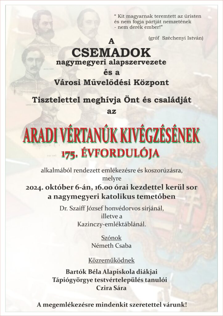 ARADI VÉRTANÚK KIVÉGZÉSÉNEK 175. ÉVFORDULÓJA NAGYMEGYEREN