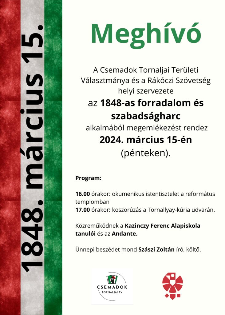 A Csemadok Tornaljai Területi Választmánya és a Rákóczi Szövetség helyi szervezete szeretettel meghív mindenkit a március 15-i rendezvényünkre, amelyen az 1848-49-es forradalom és szabadságharc hőseire emlékezünk. A rendezvény 16 órakor kezdődik a tornaljai református templomban.