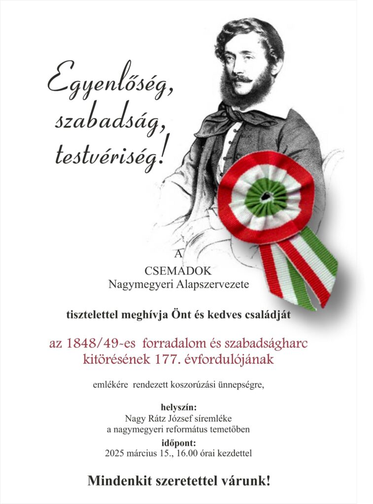 Tisztelettel meghívjuk Önöket az 1848/49-es forradalom és szabadságharc kitörésének 177. évfordulója alkalmából megrendezésre kerülő megemlékezésre, a nagymegyeri református temetőbe 2025. március 15-én a csatolt meghívó alapján.