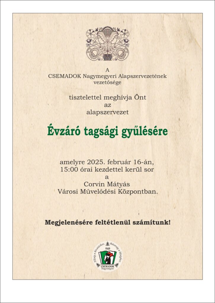 Tisztelettel meghívjuk a CSEMADOK alapszervezet évzáró tagsági ülésére, amely 2025.február 16-án (vasárnap) 15:00 órakor lesz megtartva a nagymegyeri Városi művelődési központban.