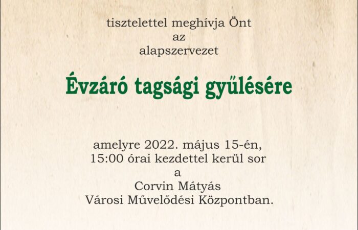 Szeretettel meghívjuk a CSEMADOK alapszervezet évzáró tagsági ülésére, amely 2022.május 15-én (vasárnap) 15,00 órakor lesz megtartva a nagymegyeri Városi művelődési központban.