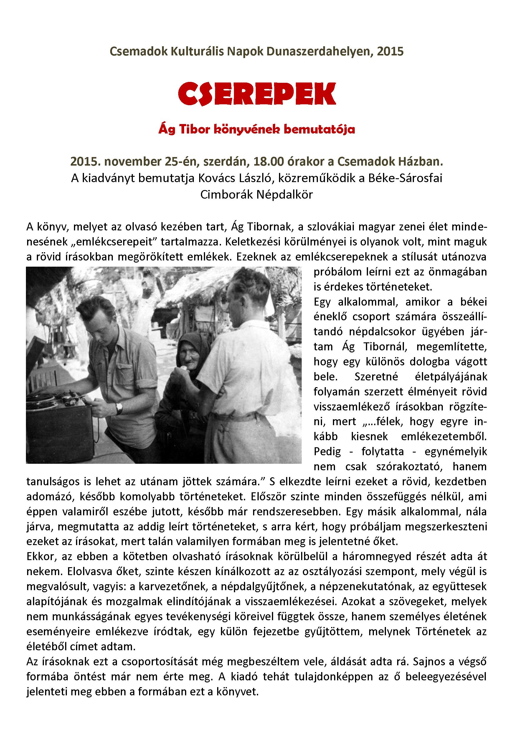 2015. november 25-én, szerdán, 18.00 órakor a Csemadok Házban.