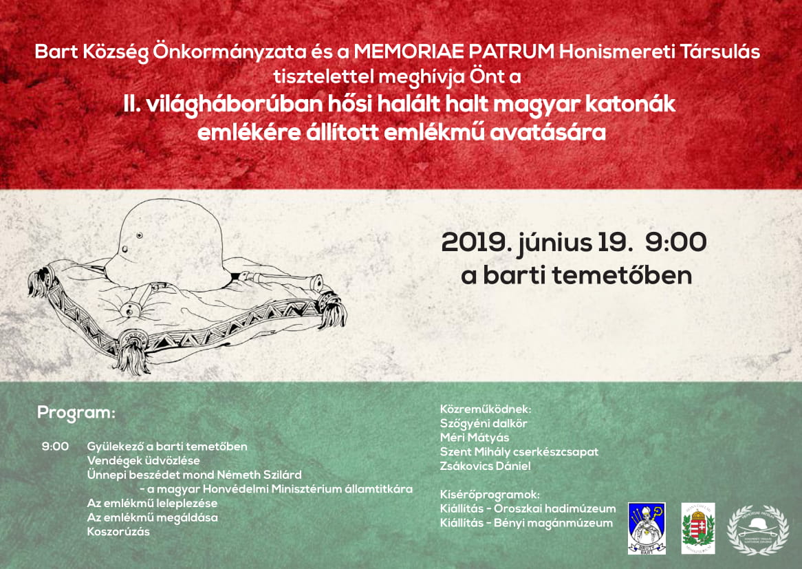 Bart község Önkormányzata és a Memoriae Patrum Honismereti Társulás tisztelettel meghív mindenkit a II. világháborúban Szlovákia területén hősi halált halt magyar katonák emlékére állított emlékmű avatására.