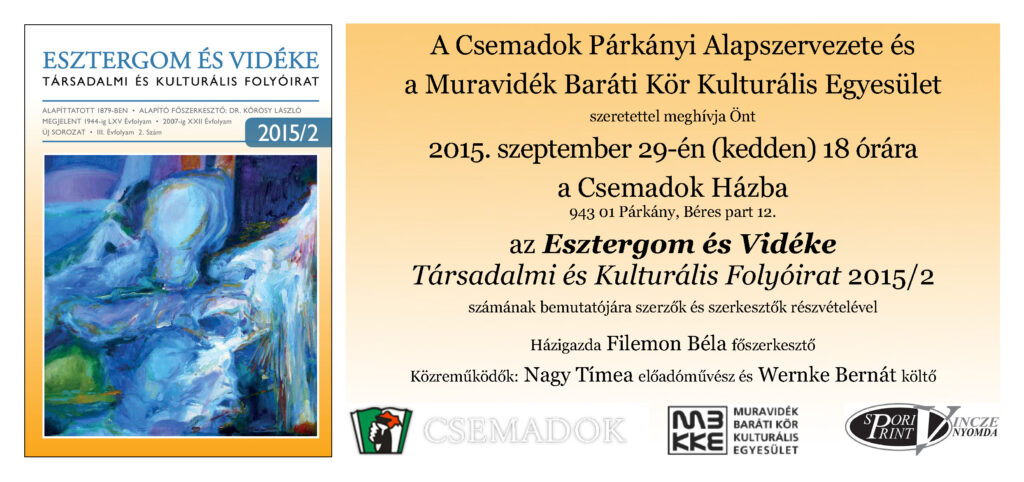 A Csemadok Párkányi Alapszervezete és a Muravidék Baráti Kör Kulturális Egyesület szeretettel meghívja Önt 2015. szeptember 29-én (kedden) 18 órára a Csemadok Házba (943 01 Párkány, Béres part 12.)
