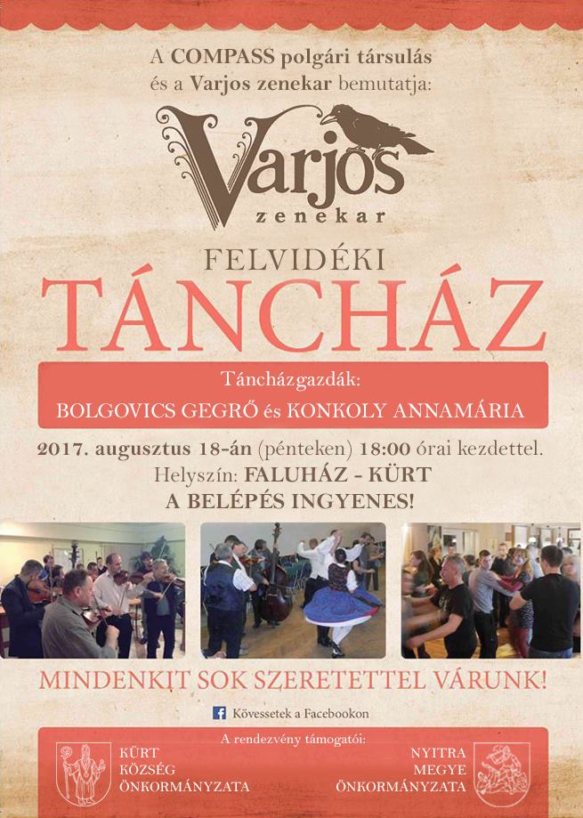 A COMPASS polgári társulás és a Varjos zenekar szeretettel vár 2017. augusztus 18-án (pénteken) 18:00 órától a kürti faluházba egy fergeteges felvidéki táncházba. Táncházgazdák: Bolgovics Gergő és Konkoly Annamária. Kürt község Önkormányzatának és Nyitra Megye Önkormányzatának köszönhetően a belépés INGYENES!