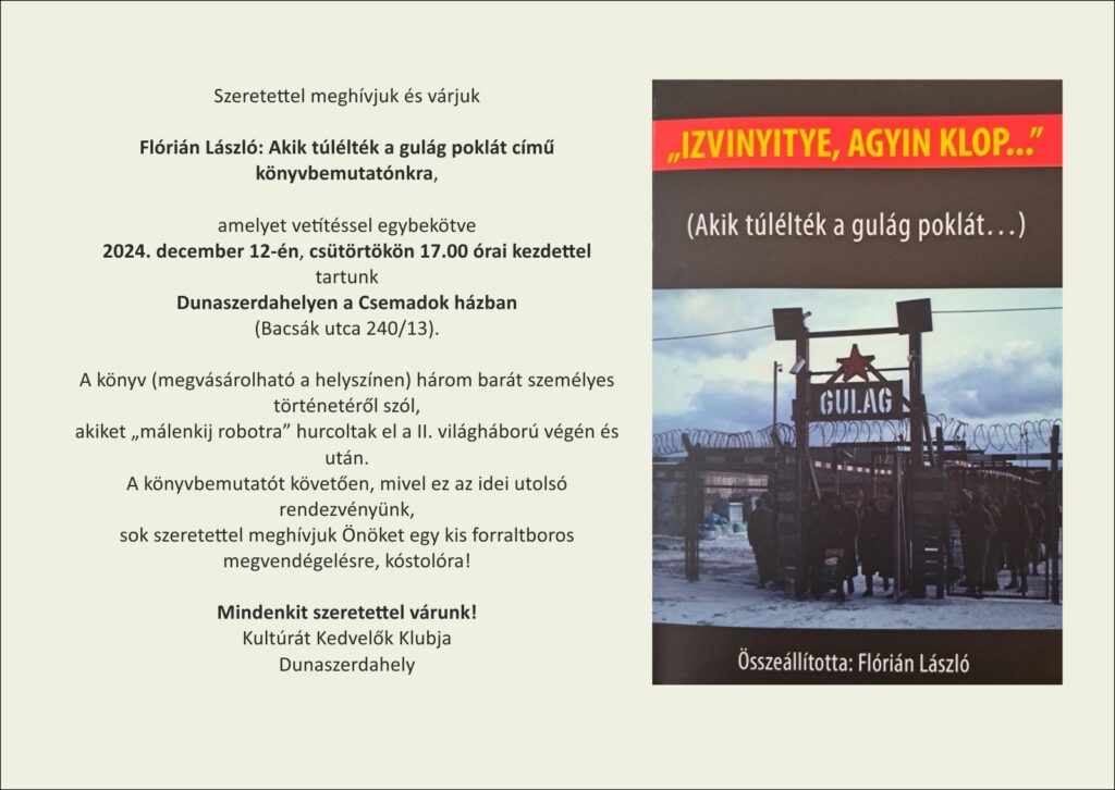 Szeretettel meghívjuk és várjuk Flórián László: Akik túlélték a gulág poklát című könyvbemutatónkra, amelyet vetítéssel egybekötve 2024. december 12-én, csütörtökön 17.00 órai kezdettel tartunk Dunaszerdahelyen a Csemadok házban (Bacsák utca 240/13).
