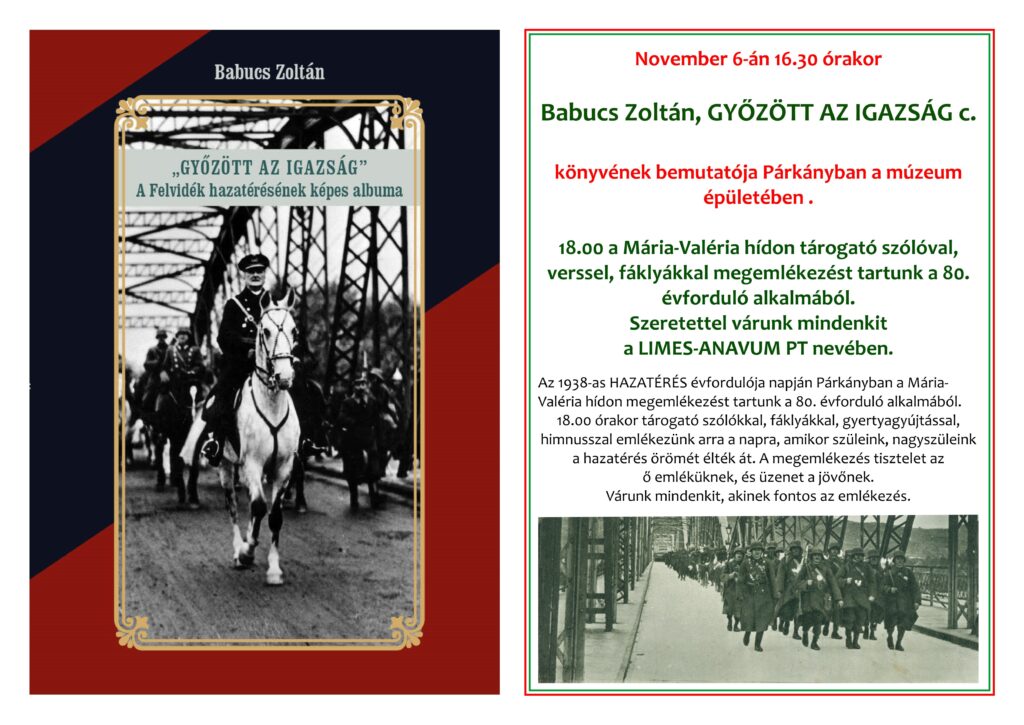 A LIMES ANAVUM Polgári Társulás november 6-án, kedden 16.30 kezdettel szervezi meg Babucs Zoltán hadtörténész „Győzött az igazság” A Felvidék hazatérésének képes albuma c. könyvének a bemutatóját a Párkányi Városi Múzeum Vámház köz 2. sz. épületében.